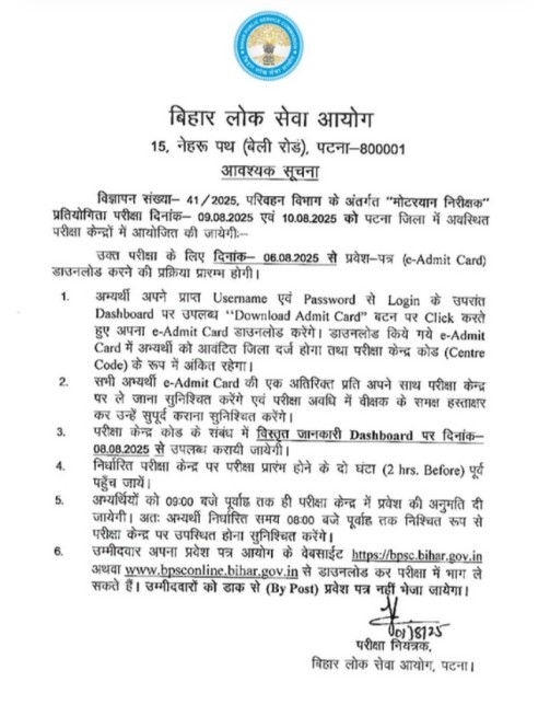 Q2. Has BPSC released the Motor Vehicle Inspector Exam Date Notice 2025?