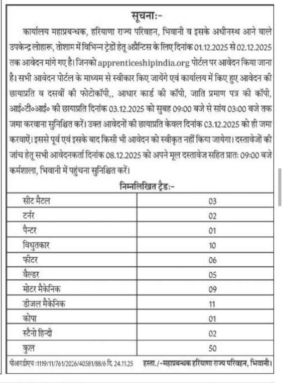 Ans. Haryana Roadways Bhiwani Apprentice Vacancy 2025 कुल 50 Posts पर जारी की गई है।