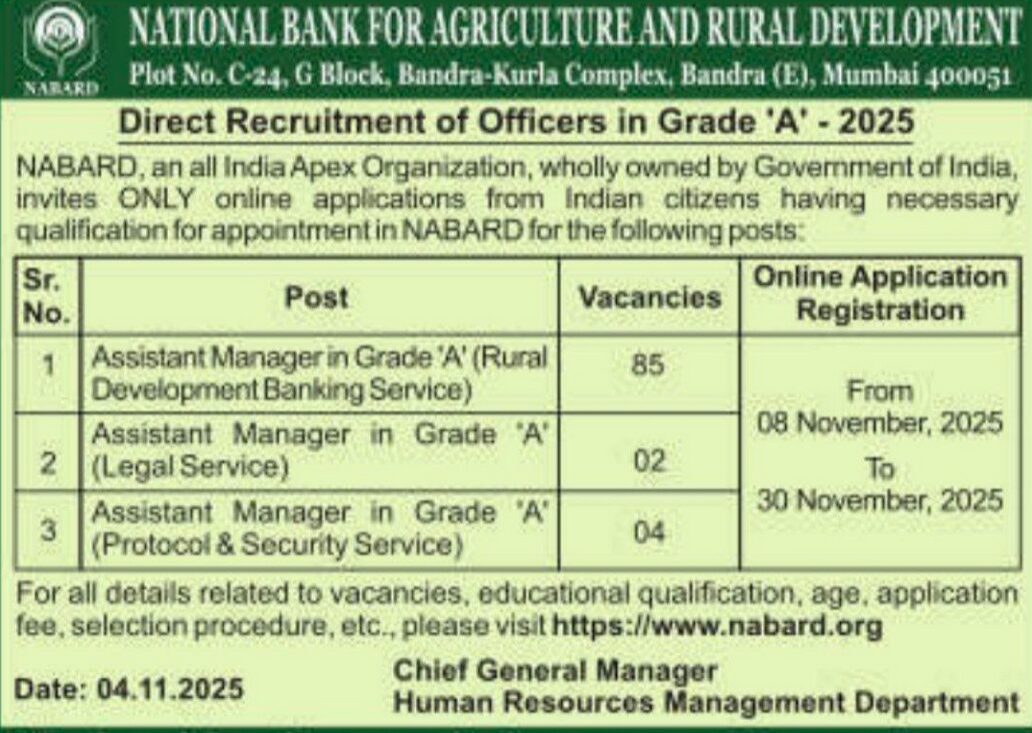 NABARD Assistant Manager (Grade‑A) Recruitment 2025 – 91 Posts | Apply 08 Nov to 30 Nov