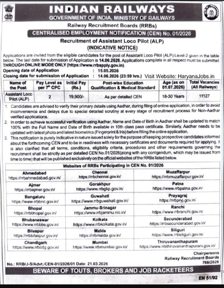 Railway Recruitment Board ने Assistant Loco Pilot (ALP) पदों पर भर्ती के लिए शॉर्ट नोटिस जारी किया है। इस भर्ती के अंतर्गत लगभग 11,127 पदों पर नियुक्ति की जाएगी। ऑनलाइन आवेदन प्रक्रिया 15 मई 2026 से शुरू होकर 14 जून 2026 तक चलेगी। उम्मीदवारों को सलाह दी जाती है कि आवेदन करने से पहले आधिकारिक नोटिफिकेशन ध्यान से पढ़ें।